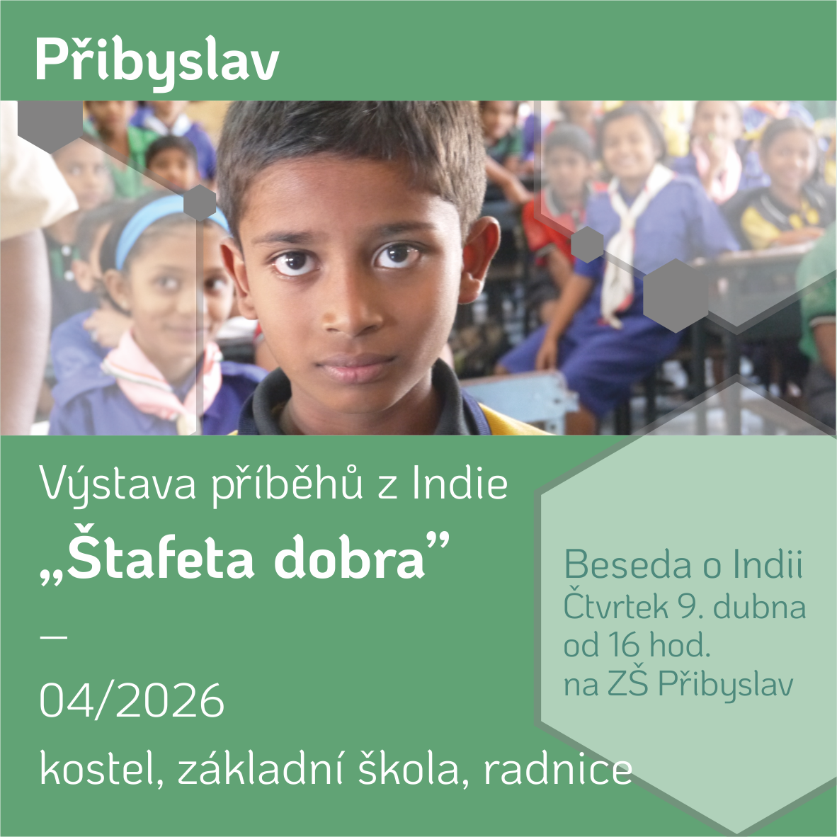 Zveme Vás v dubnu do Přibyslavi, kde na třech místech bude si moc prohlédnout různé příběhy z Indi naší putovní výstavy „Štafeta dobra“. K vidění budou v kostele Narození sv. Jana Křtitele, v základní škole a na radnici. Ve čtvrtek 9. dubna 2026 od 16 hod. Vás srdečně zveme na besedu o životě indických dětí, která se uskuteční v rámci Školní kavárny.